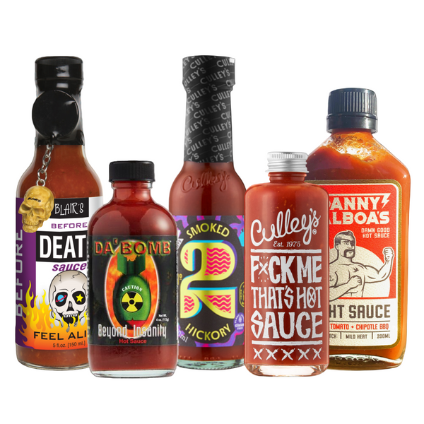 A winning combination of five Blonde Chilli big brand hot sauces in a limited time value pack!